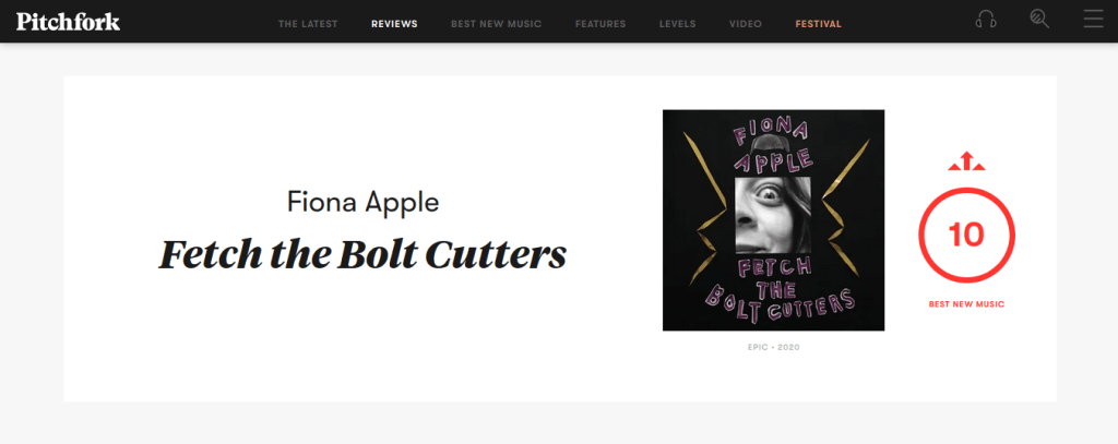 Kemarin saya menemukan bahwa album baru Fiona Apple, Fetch the Bolt Cutters mendapat review sepuluh bintang di situs web musik Pitchfork. Iya betul, 10 bintang. Artinya, Pitchfork menilai album ini sempurna dalam segala hal, baik segi aransemen musik maupun penulisan lirik. Dan sependek pengetahuan saya, jarang-jarang media se-edgy Pitchfork menyematkan sepuluh bintang untuk sebuah album musik.