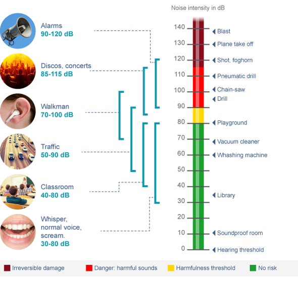 • From 90 to 115 dB (red): danger zone: the louder the sound, the less time it takes for damage to occur.